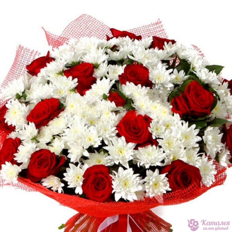Букет состоит из 17 красных роз, 15 веток белой хризантемы, красивая упаковка.