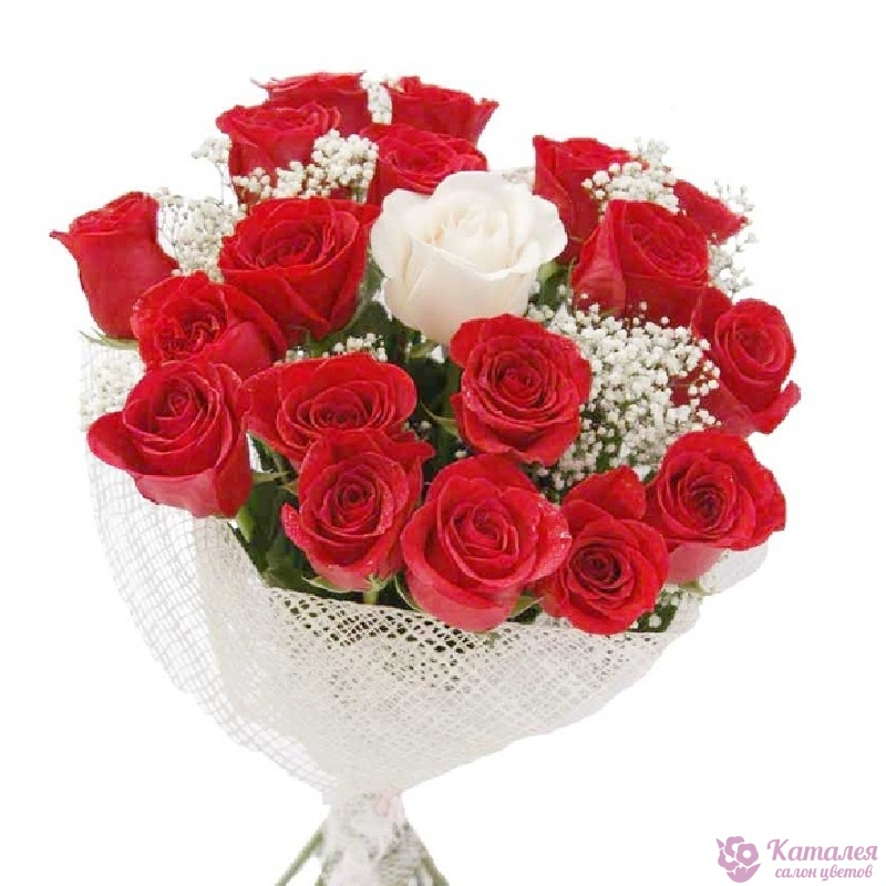 Букет состоит из 18 красных роз, 1 белая роза, 2 ветки гипсофилы, красивая упаковка, атласная лента.