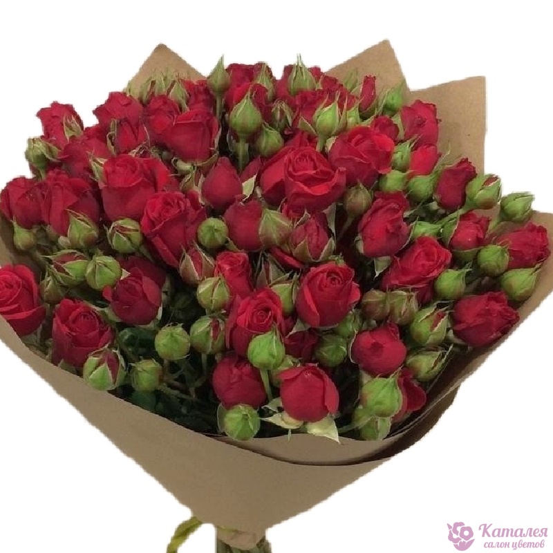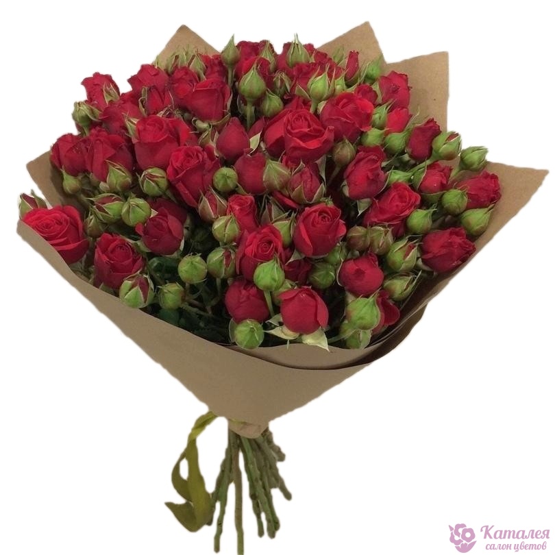 Букет состоит из 11 красных кустовых роз, крафт, атласная лента.