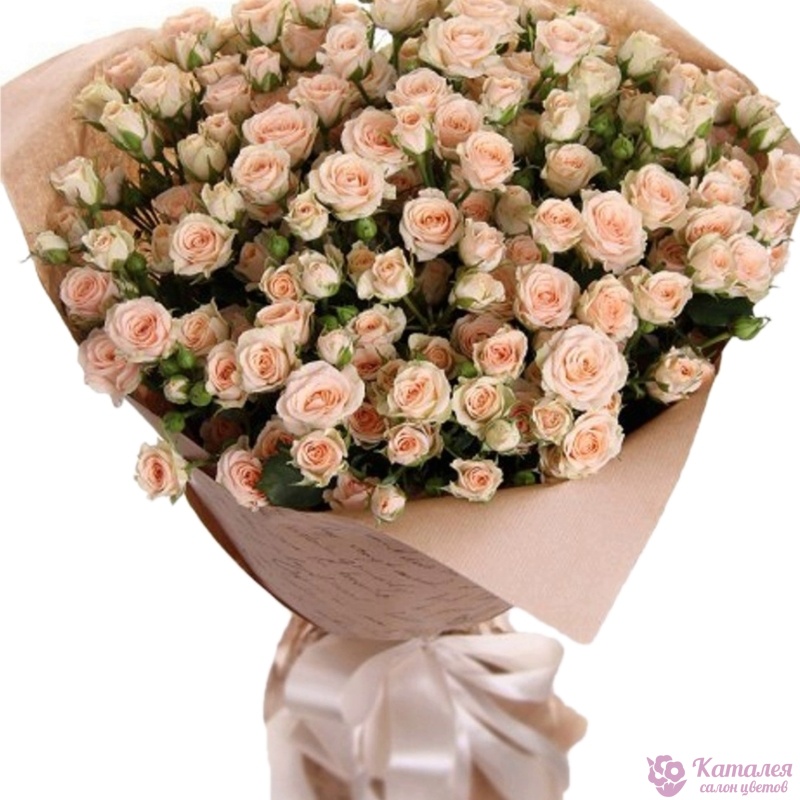 Букет состоит из 35 кустовых кремовых роз, крафт, атласная лента.