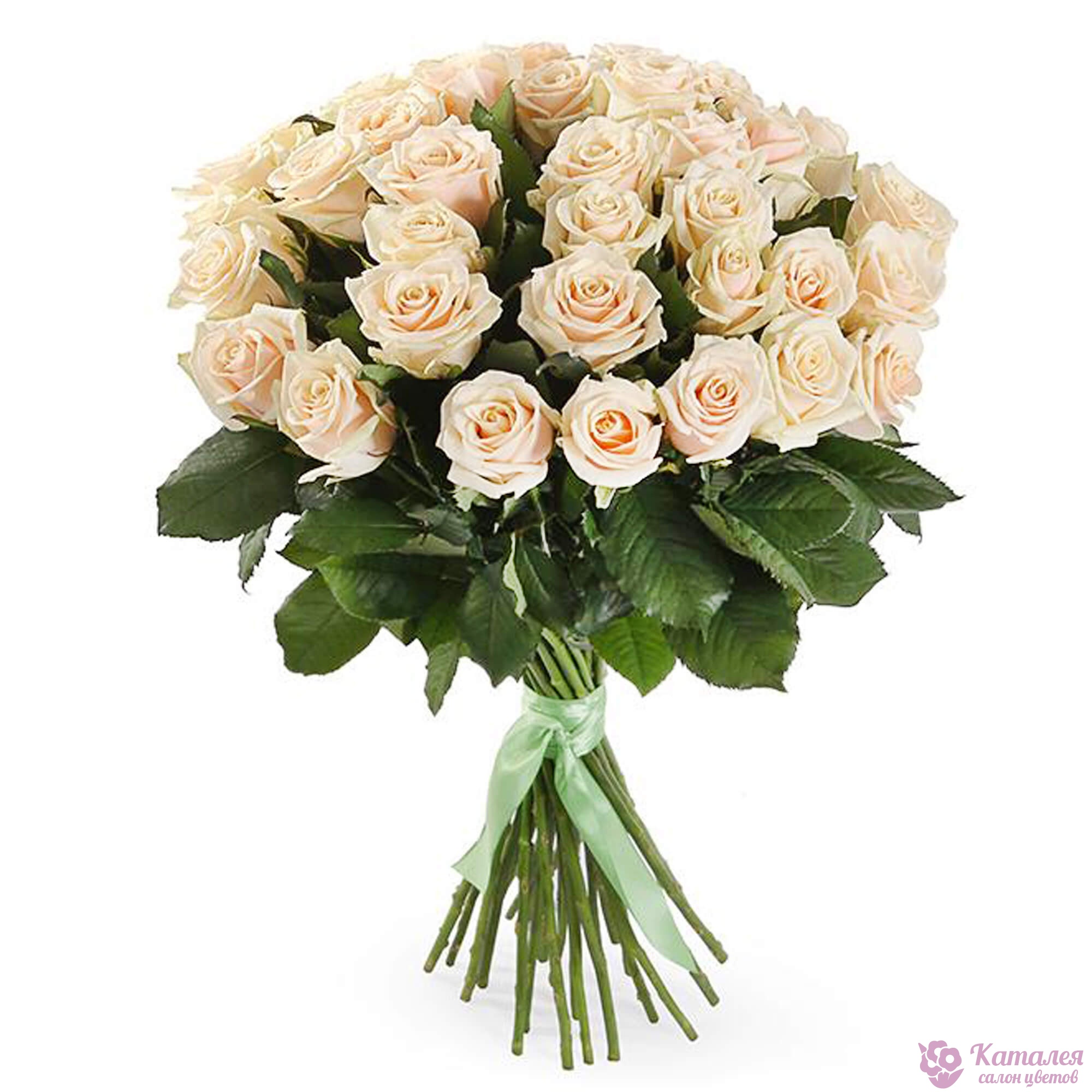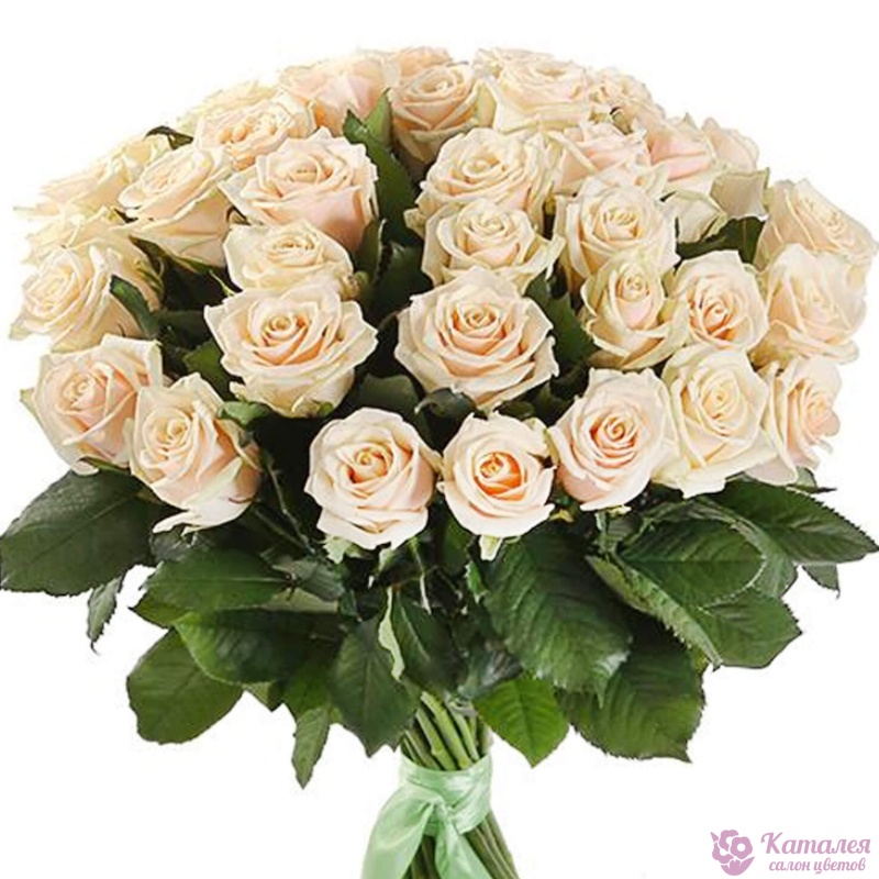 Букет состоит из 35 кремовых роз, прозрачная упаковка, бежевая лента.