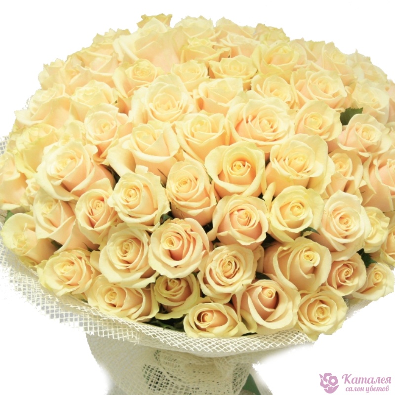 Букет состоит из 55 кремовых роз, красивая упаковка, атласная лента.