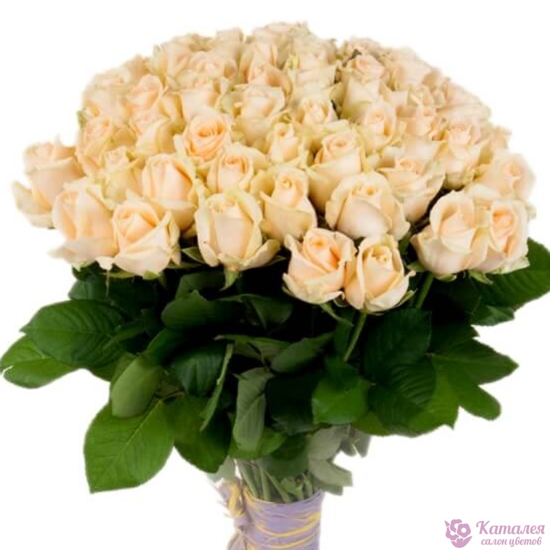 Букет состоит из 55 кремовых роз, прозрачная упаковка, атласная лента.