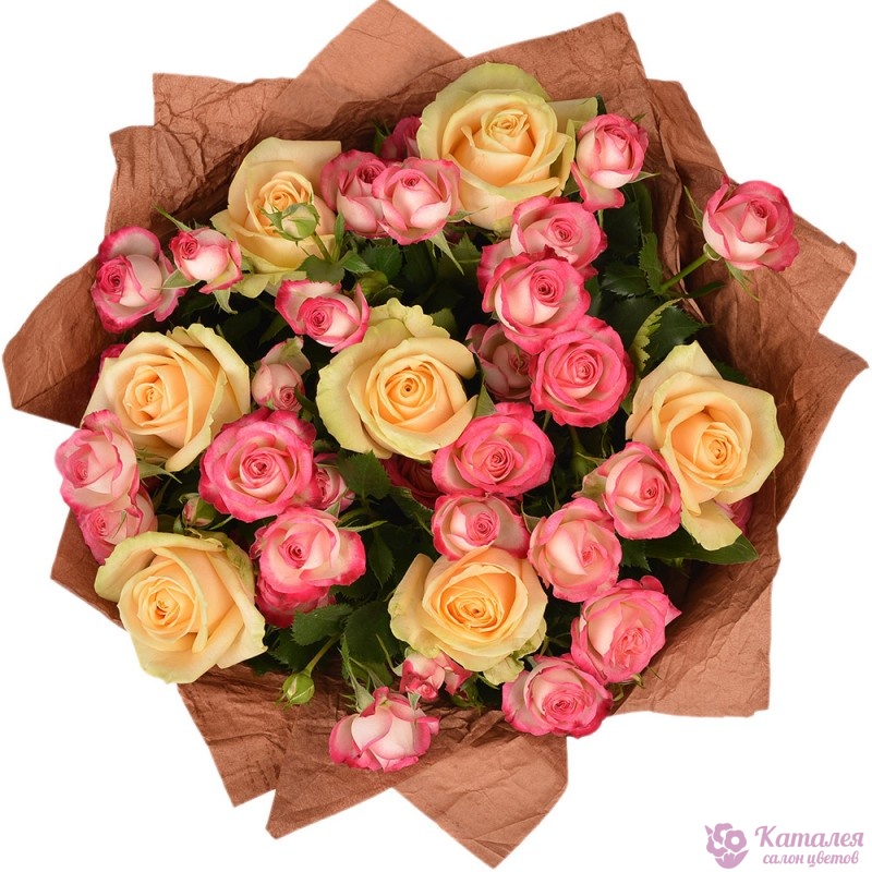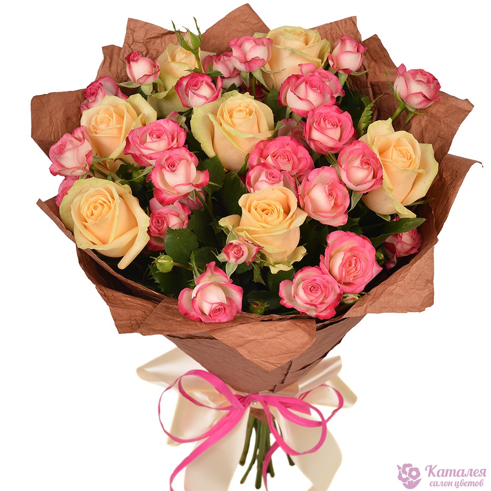 Букет состоит из 7 кремовых роз, 6 веток розовой кустовой розы, крафт, кремовая или розовая лента.