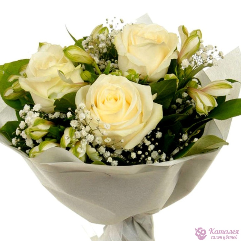 Букет состоит из 3 кремовые розы, 2 ветки белой альстромерии, 2 ветки гипсофилы, красивая упаковка, атласная лента.