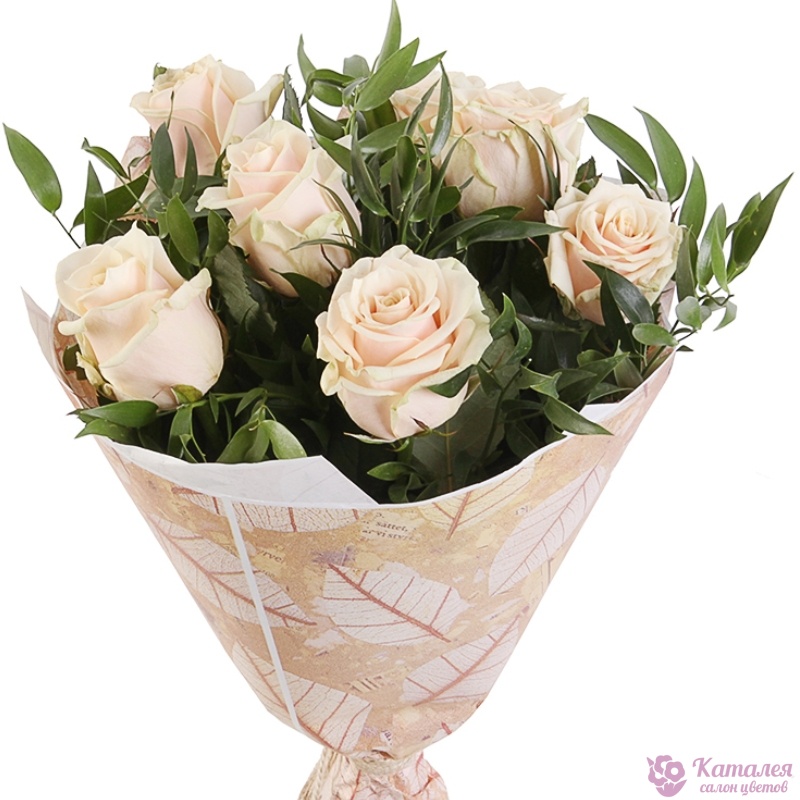 Букет состоит из 9 кремовых роз, зелень, крафт, бежевая лента.