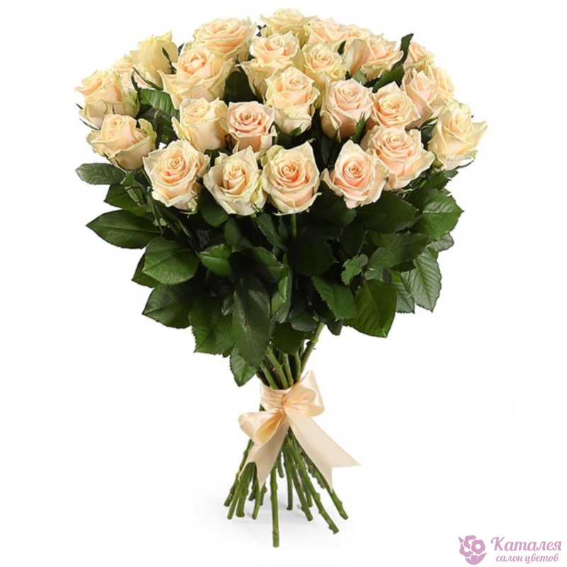 Букет состоит из 25 кремовых роз, прозрачная упаковка, атласная лента.