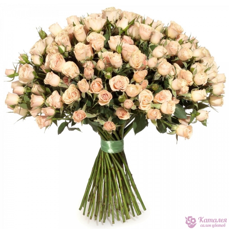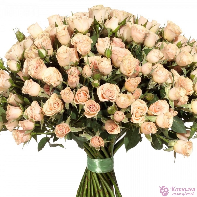 Букет состоит из 45 кремовых кустовых роз, прозрачная упаковка, атласная лента.