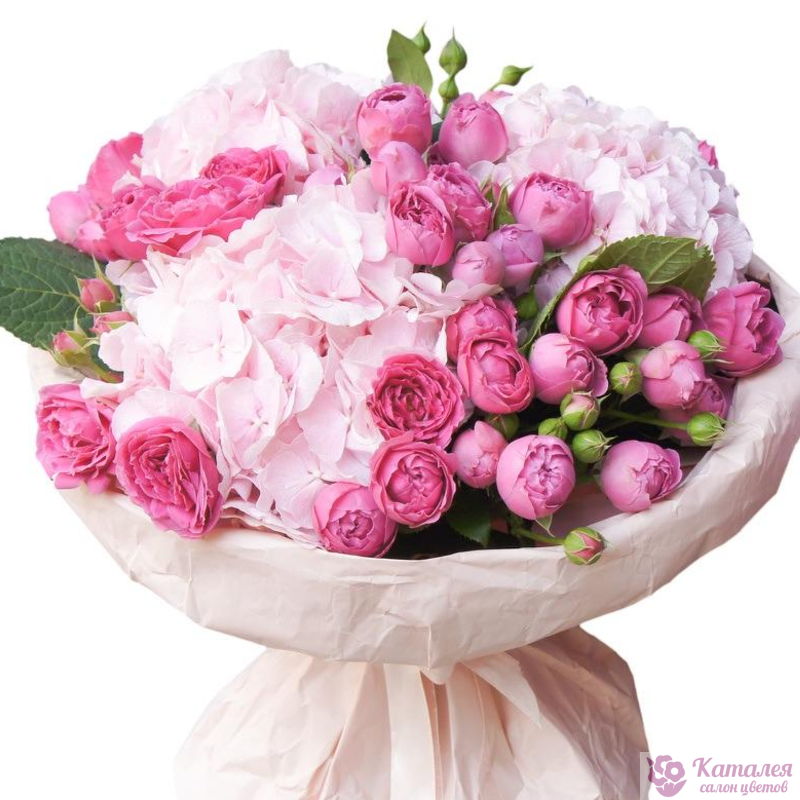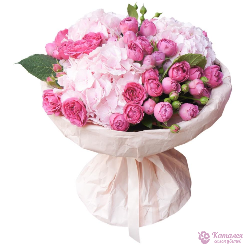 Букет состоит из 3 розовые гортензии, 10 веток пионовидных роз, зелень, крафт.
