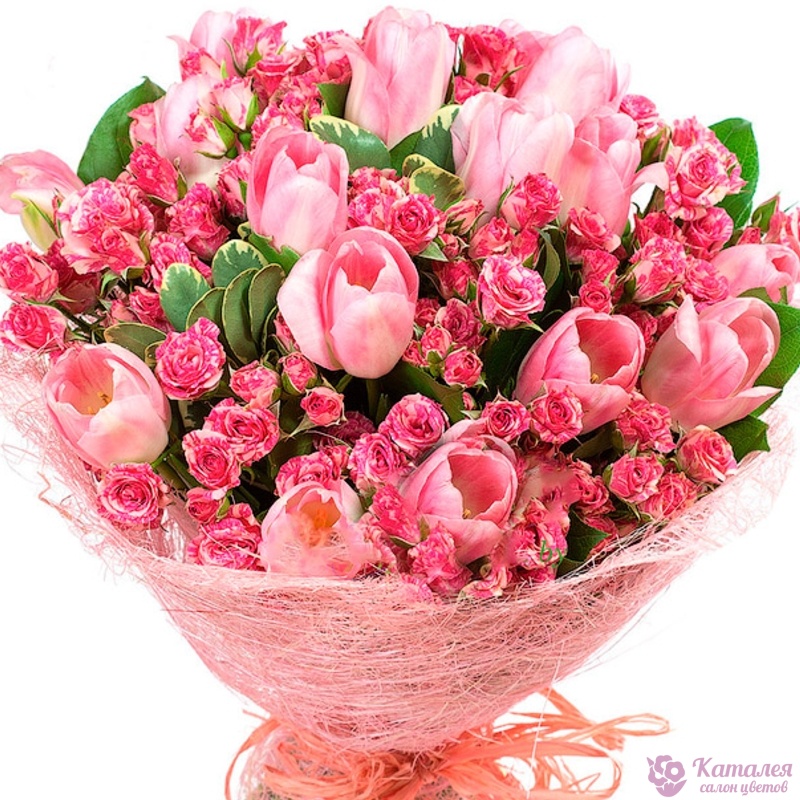 Букет состоит из 15 розовых тюльпанов, 8 розовых кустовых роз, зелень, красивая упаковка, атласная лента.