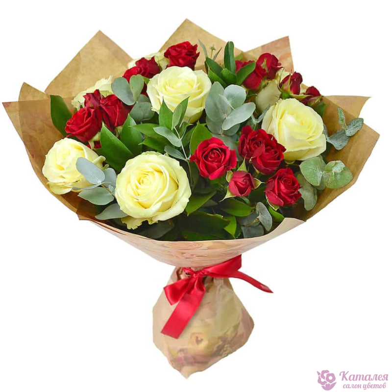 Букет состоит из 7 белых роз, 4 ветки красных кустовых роз, эвкалипт, крафт, атласная лента.