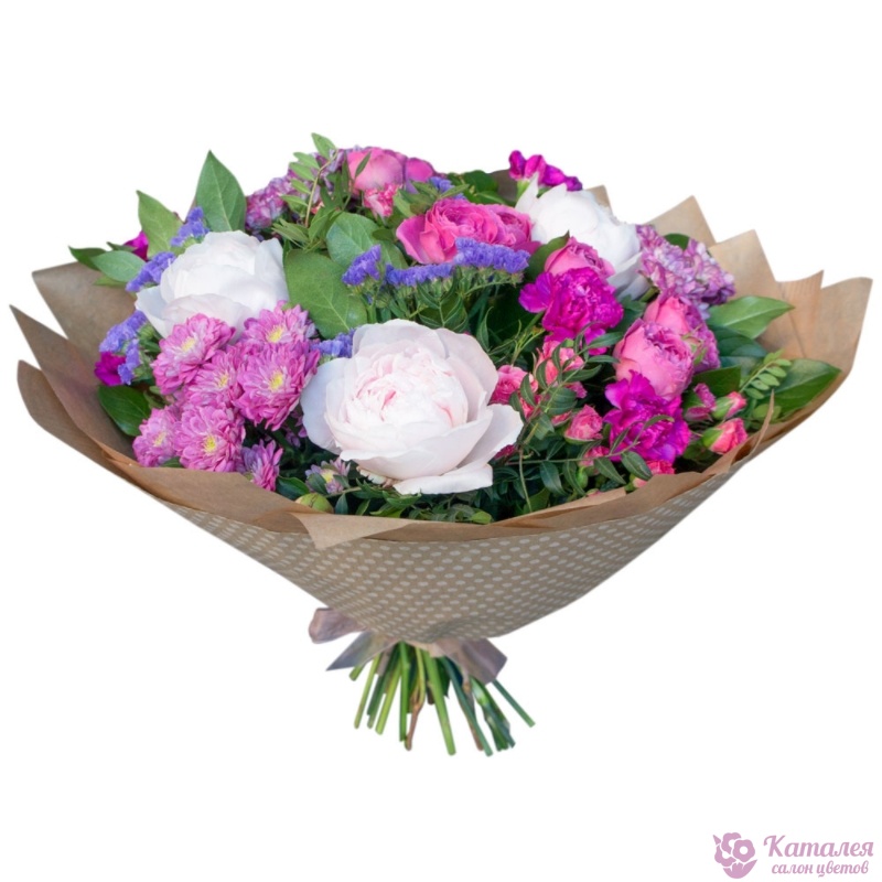 Букет состоит из 3 пиона, 3 ветки хризантемы, 4 ветки кустовых роз, 7 гвоздик, 3 статица, зелень, крафт, атласная лента.
