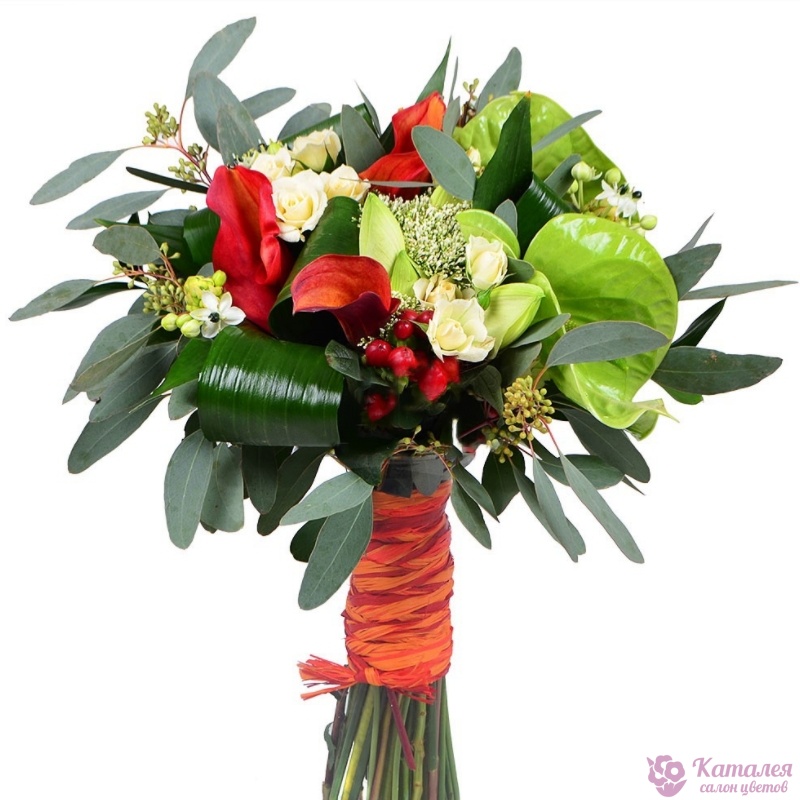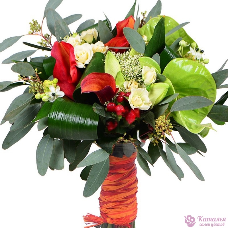 Букет состоит из 3 оранжевые каллы, 2 антуриума, 1 амариллис, 2 ветки гиперикума, 3 ветки кустовой розы, 3 цветка орнитогалума, декоративная зелень, прозрачная упаковка, атласная лента.