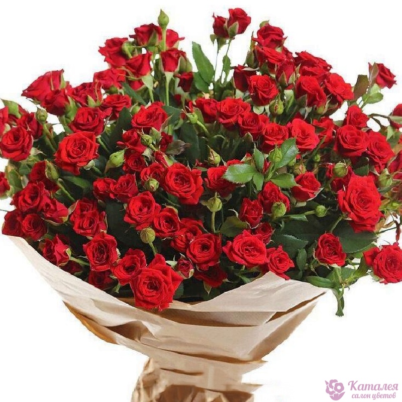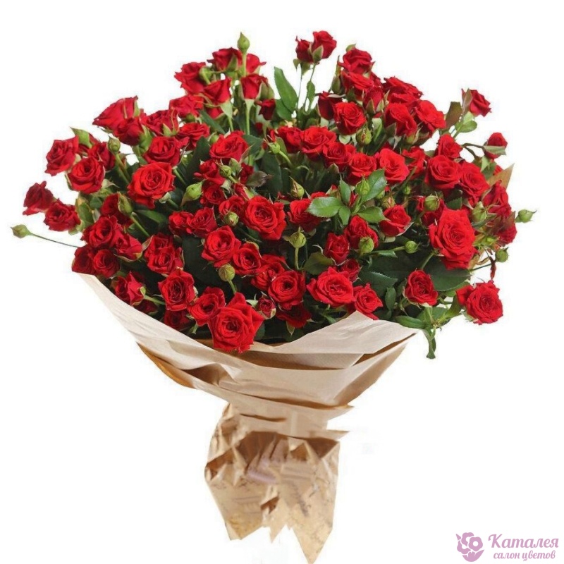 Букет состоит из 15 красных кустовых роз, крафт, атласная лента.