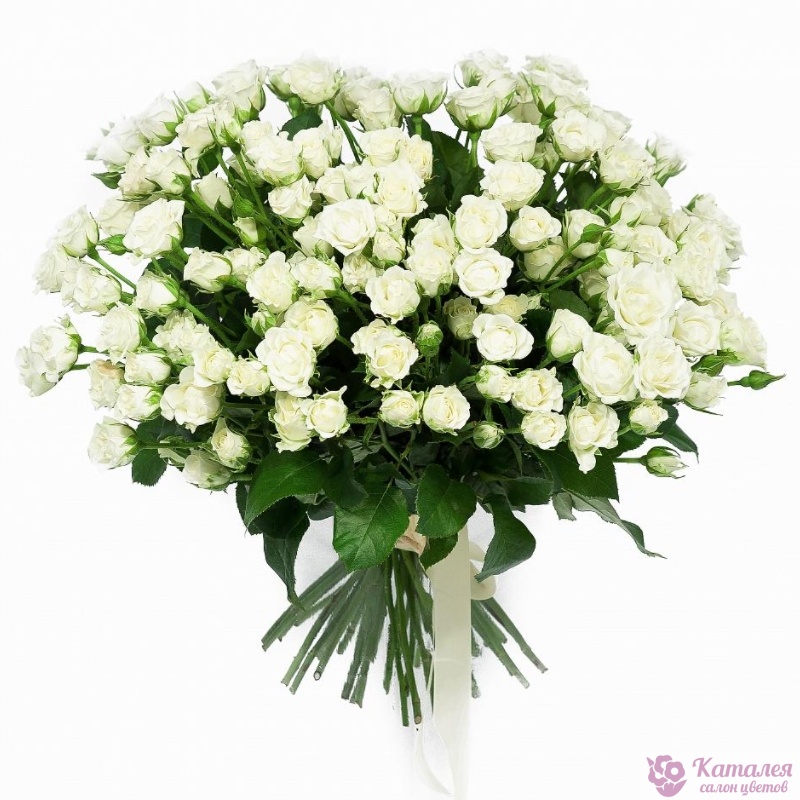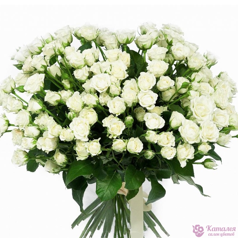 Букет состоит из 35 белых кустовых роз, прозрачная упаковка, атласная лента.