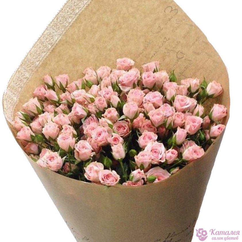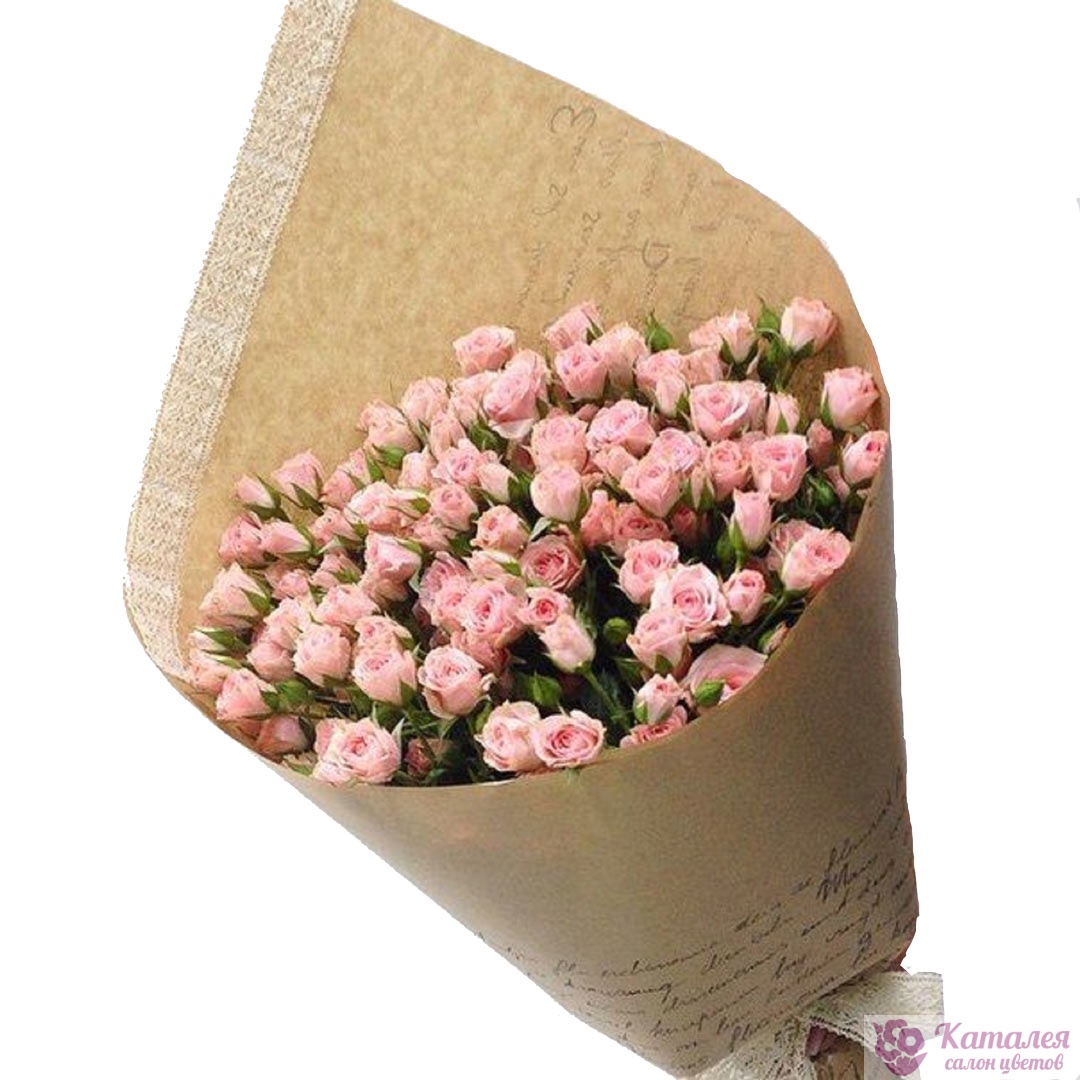 Букет состоит из 11 веток кустовой розовой розы, крафт.