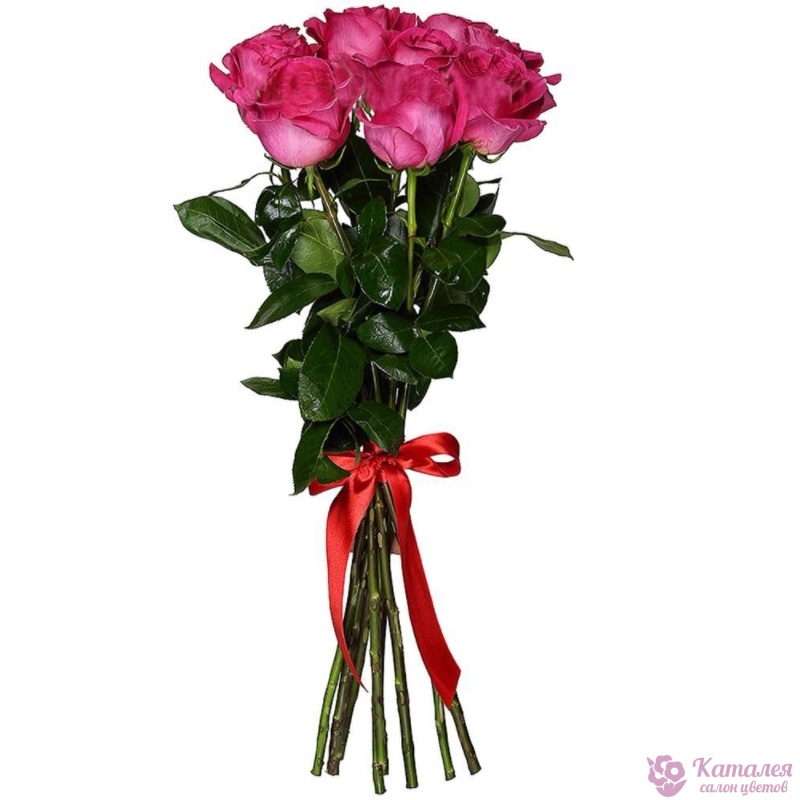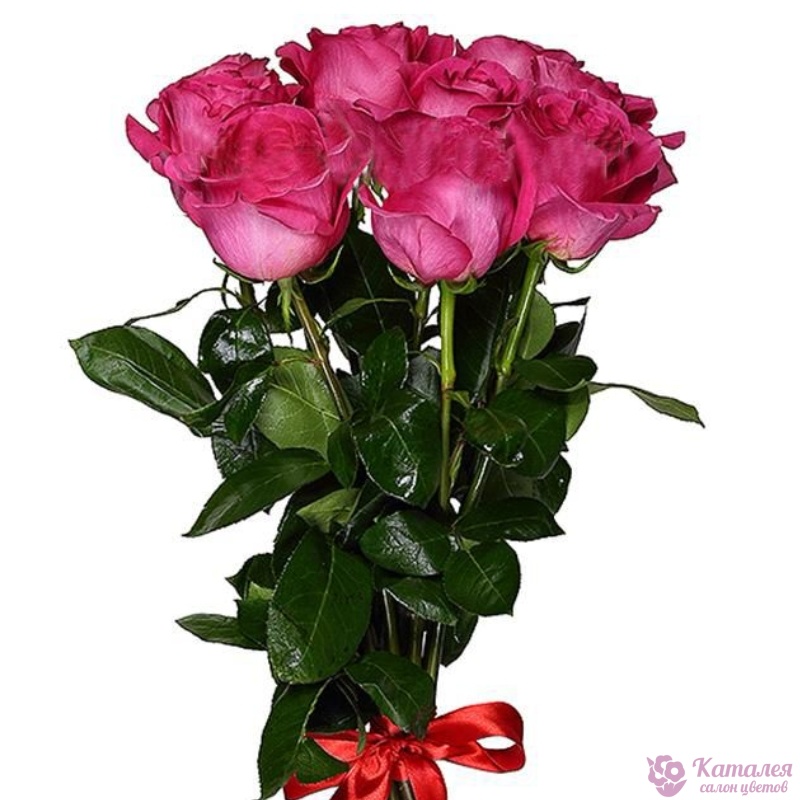 Букет состоит из 7 малиновых роз, прозрачная упаковка, атласная лента.