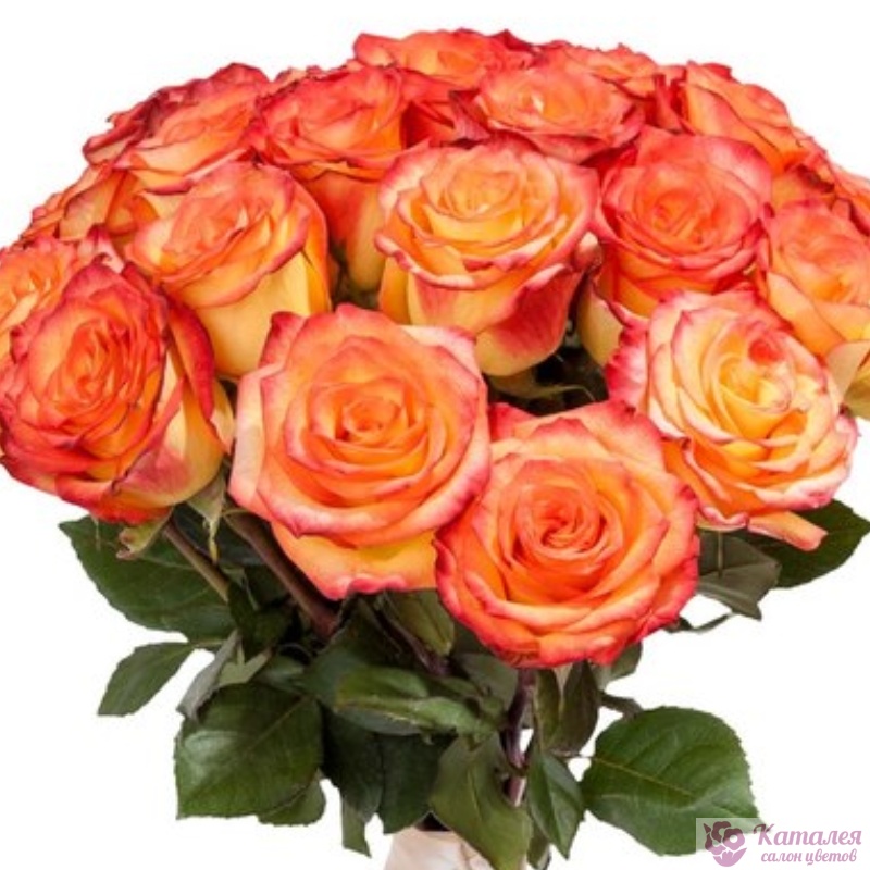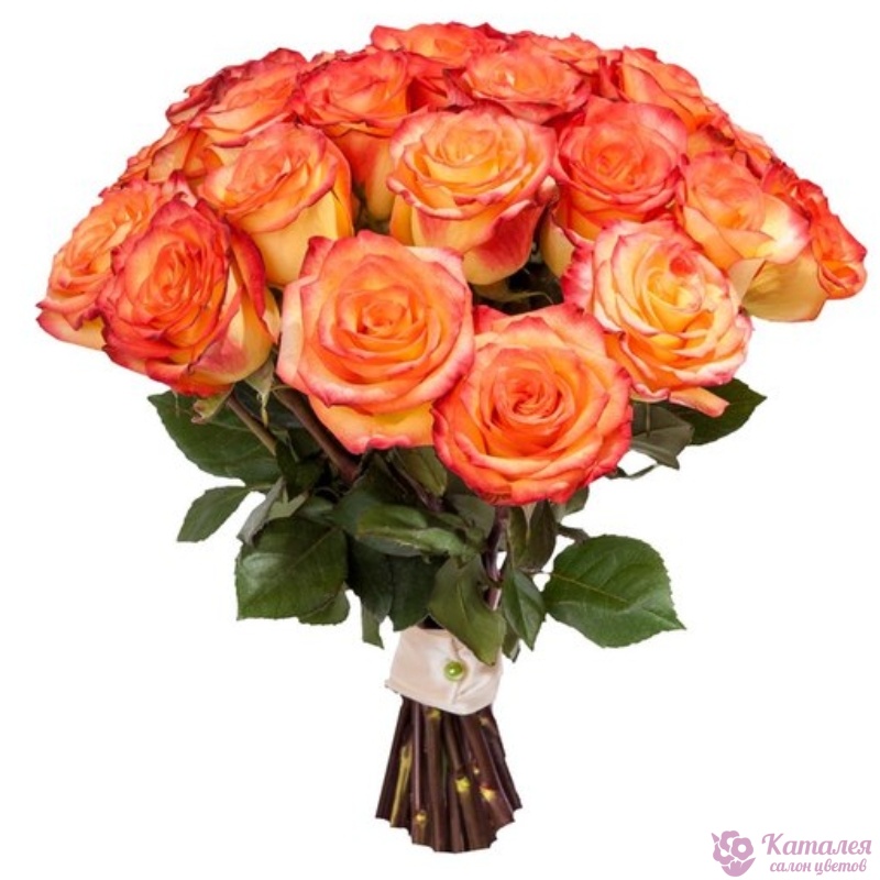Букет состоит из 25 оранжевых роз, прозрачная упаковка, атласная лента.