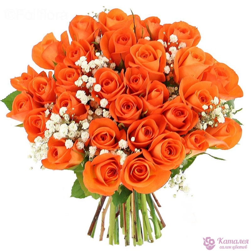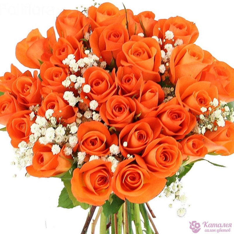 Букет состоит из 35 оранжевых роз, 4 гипсофила, прозрачная упаковка, атласная лента.