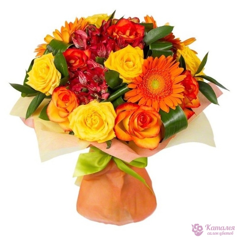 Букет состоит из 3 герберы, 11 роз, 5 альстромерий, аспидистра, рускус, красивая упаковка, атласная лента.