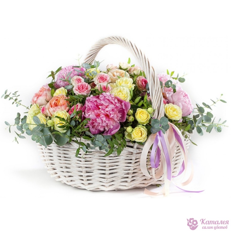 Букет состоит из 5 пионов, 5 пионовидных роз, 9 веток кустовых роз, зелень, корзина, оазис.
