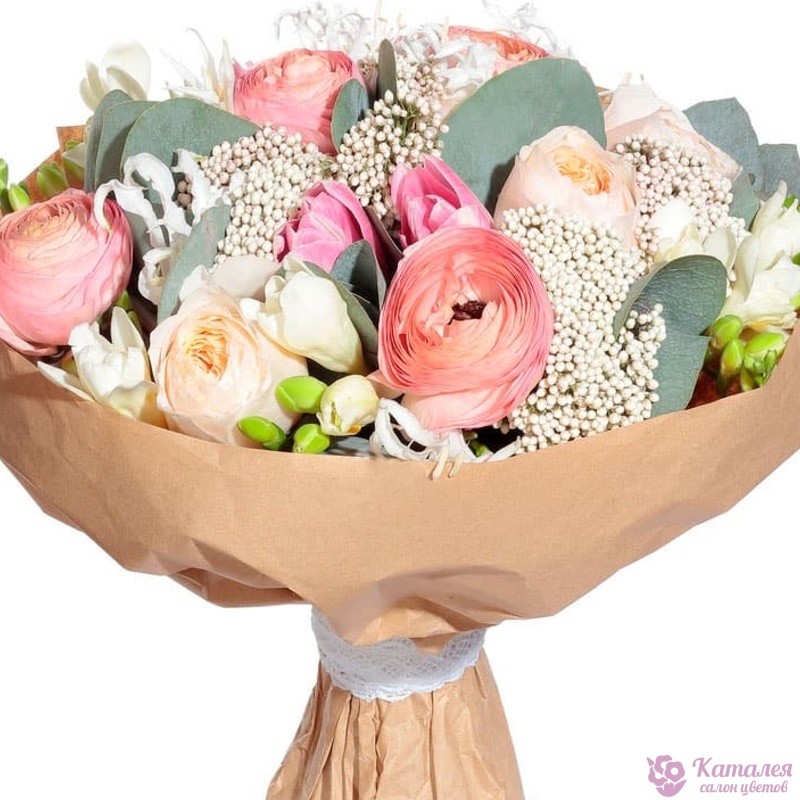 Букет состоит из 4 ранункулюса, 3 пионовидные розы, 7 веток фрезий, 3 цветка озотамнуса, эвкалипт, крафт, атласная лента.