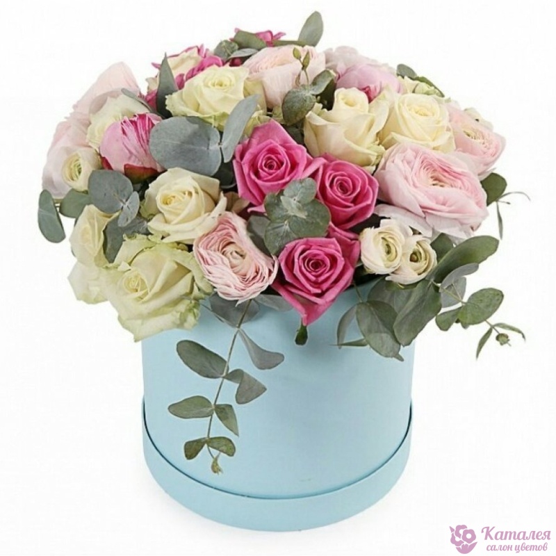 Букет состоит из 17 роз, 9 ранункулюсов, 3 пионовидные розы, эвкалипт, коробка, оазис.
