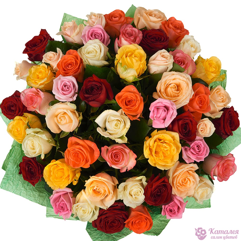 Букет состоит из MIX из 55 роз разных цветов, красивая упаковка, атласная лента.