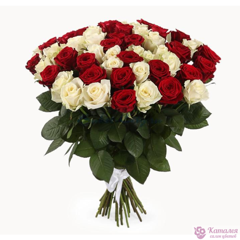 Букет состоит из 51 красная и белая роза, прозрачная упаковка, атласная лента.