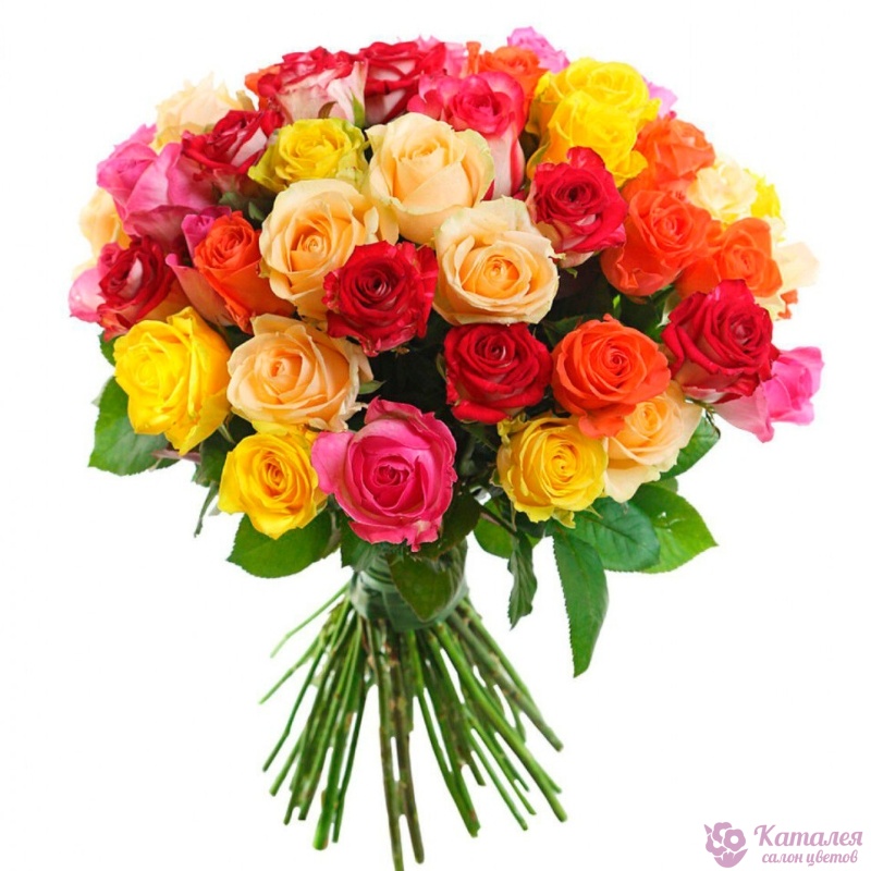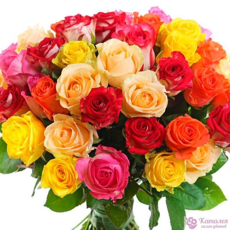 Букет состоит из MIX из 55 роз Кения, прозрачная упаковка, атласная лента.