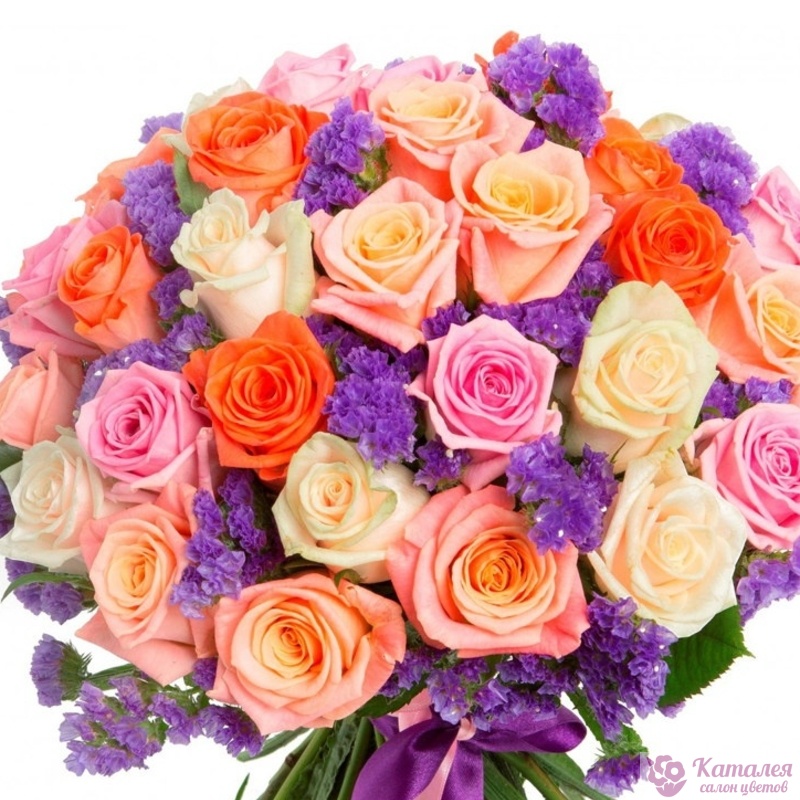 Букет состоит из MIX из 45 роз, 7 статица, прозрачная упаковка, атласная лента.