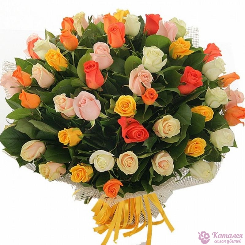 Букет состоит из MIX из 51 розы, сетка, атласная лента.