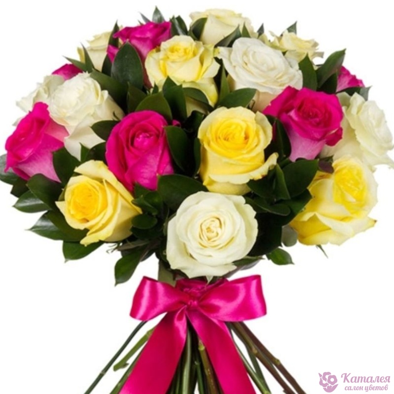 Букет состоит из MIX из 19 роз, прозрачная упаковка, атласная лента.
