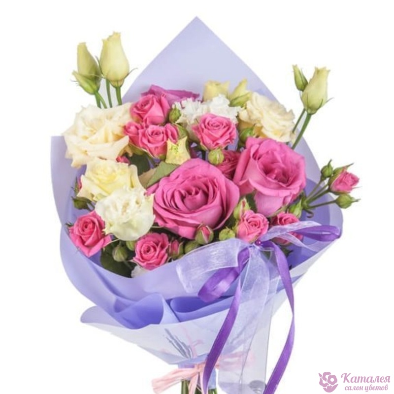 Букет состоит из 3 белые розы, 3 розовые розы, 3 ветки кустовых роз, 2 ветки эустомы, красивая упаковка, атласная лента.