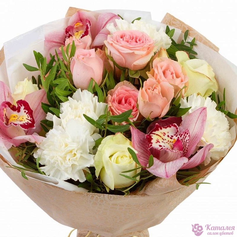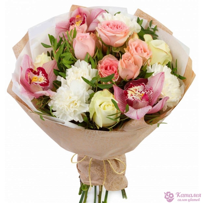 Букет состоит из 10 роз, 4 гвоздики, 3 орхидеи, зелень, крафт, атласная лента.