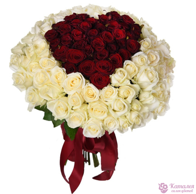 Букет состоит из 101 белая и красная роза, прозрачная упаковка, атласная лента.