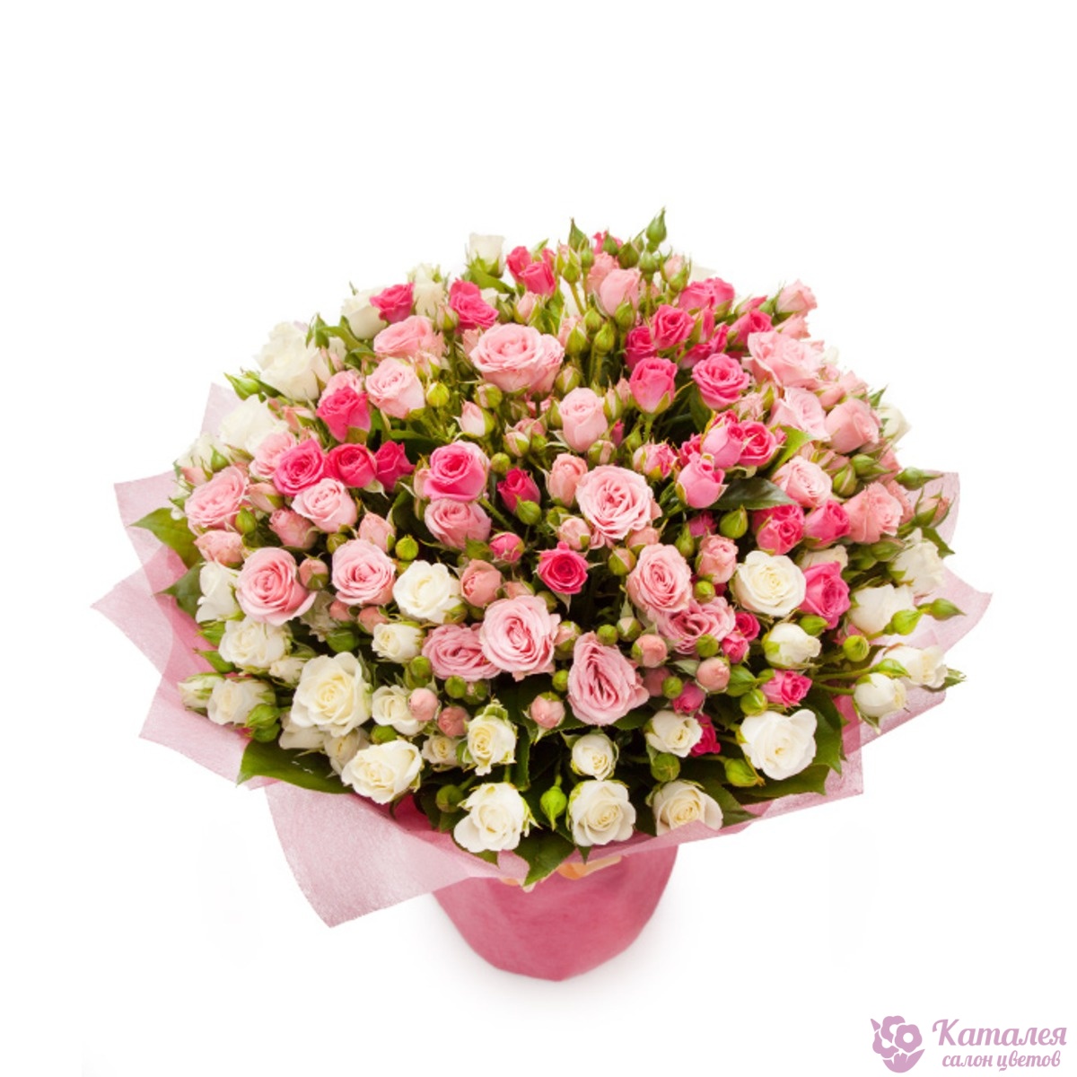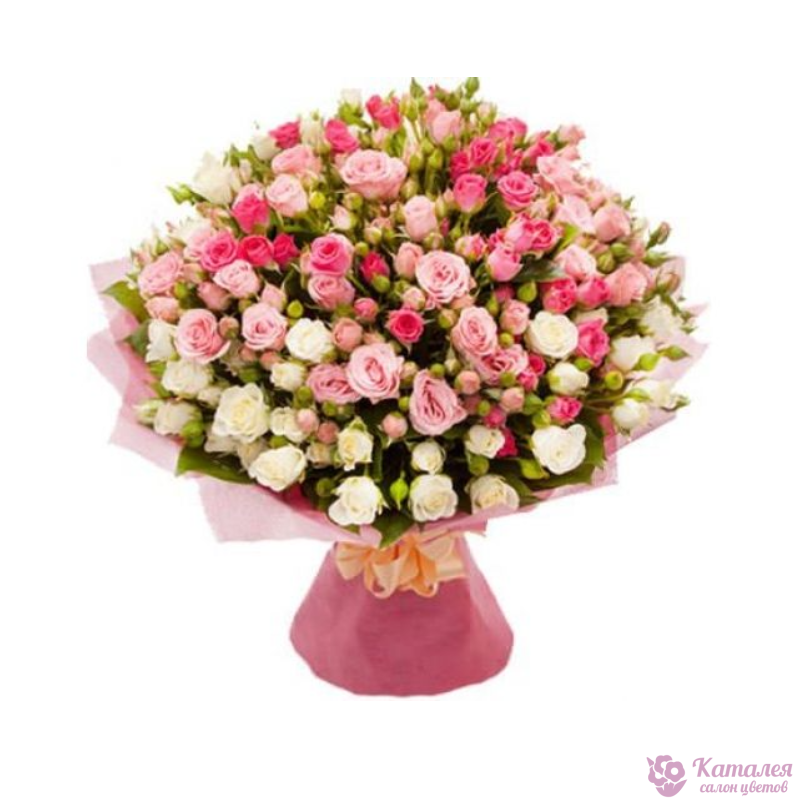 Букет состоит из 51 ветка белой и розовой кустовой розы, красивая упаковка.