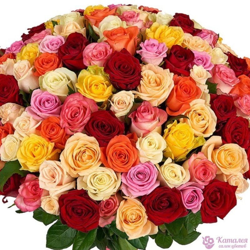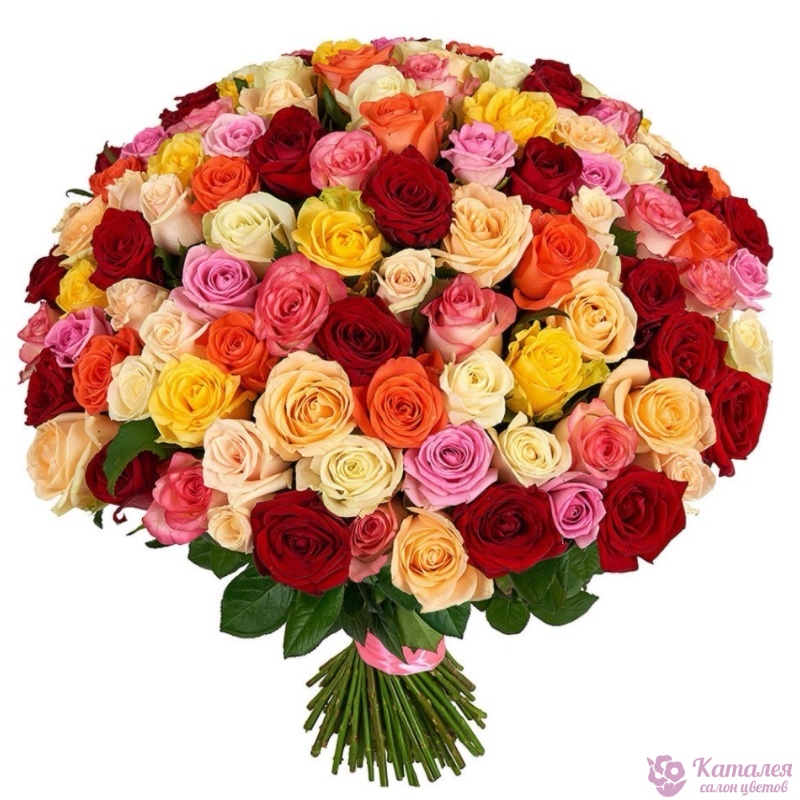 Букет состоит из MIX из 101 белой / желтой / красной / розовой / коралловой и малиновой розы, прозрачная упаковка, атласная лента.
