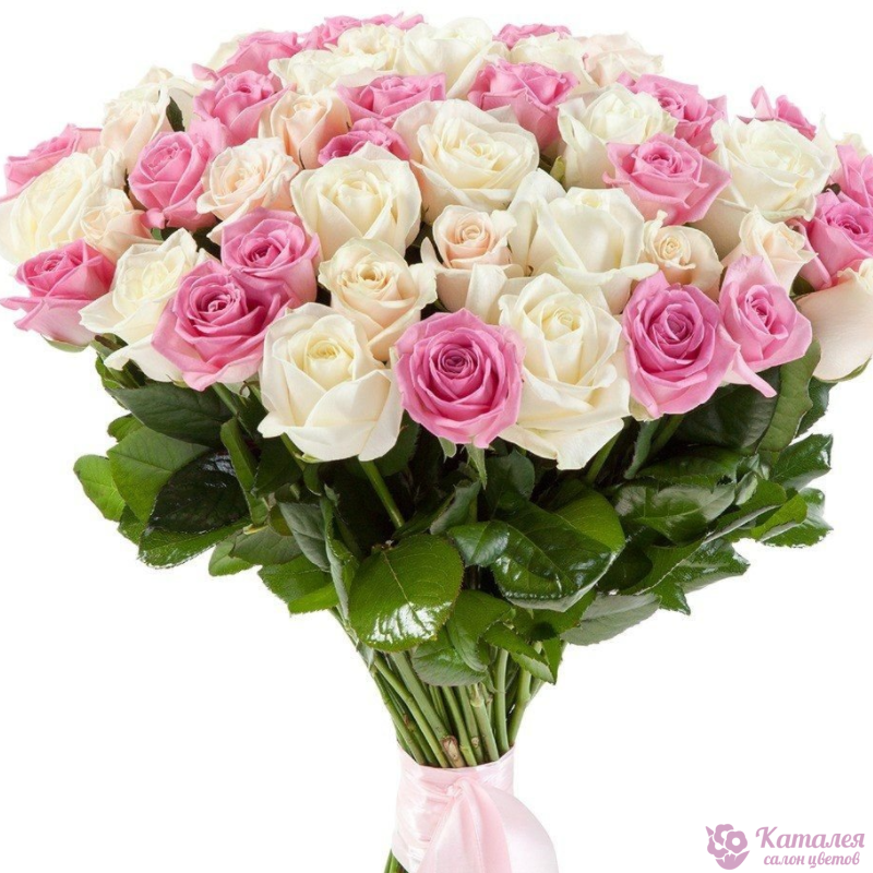 Букет состоит из 26 белых роз, 25 розовых роз, прозрачная упаковка, атласная лента.