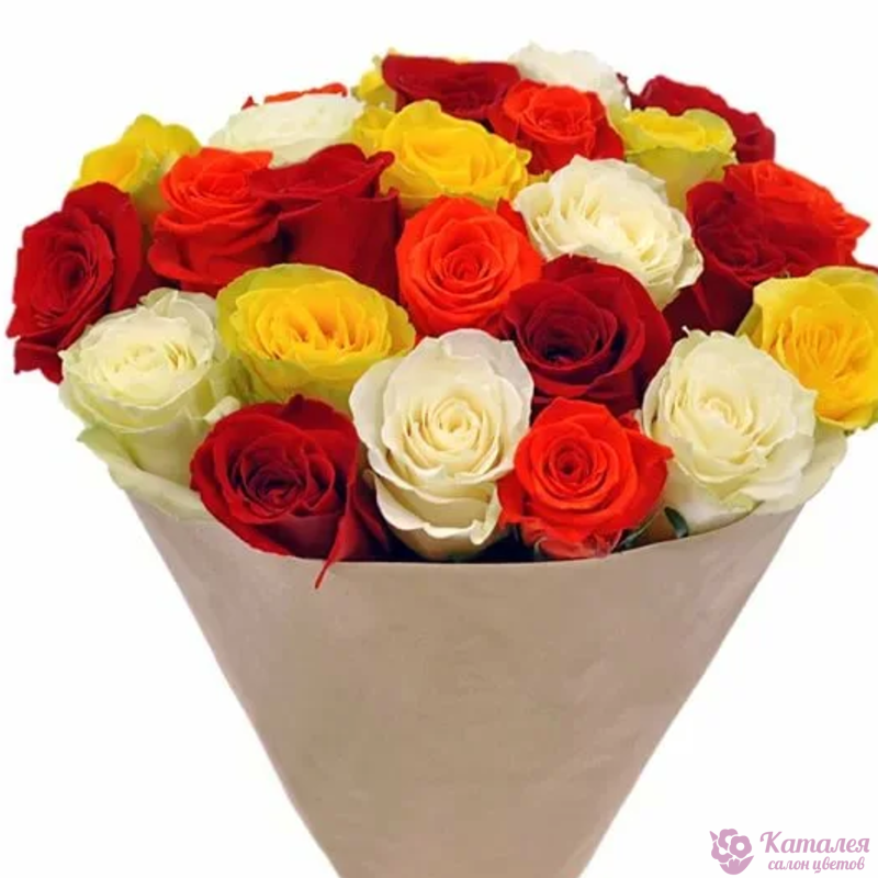 Букет состоит из MIX из 21 розы, крафт, атласная лента.