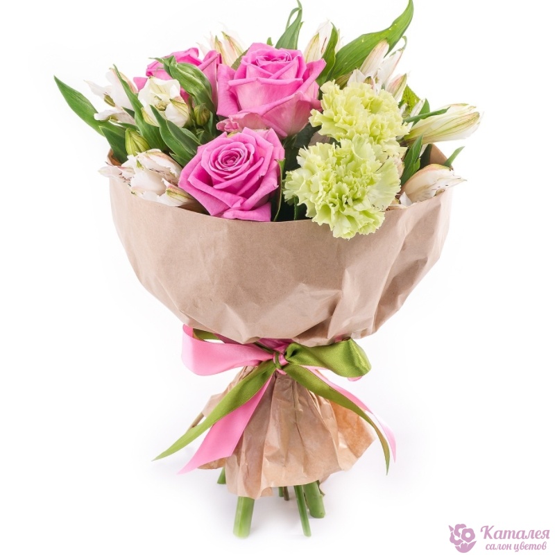 Букет состоит из 3 розы, 2 гвоздики, 4 альстромерии, крафт, атласная лента.