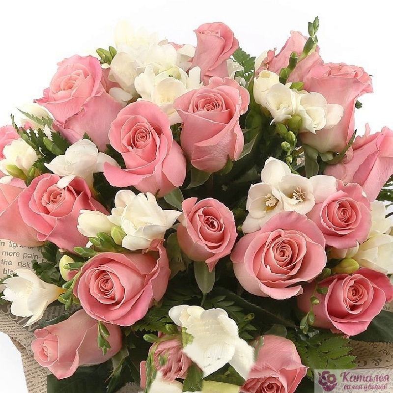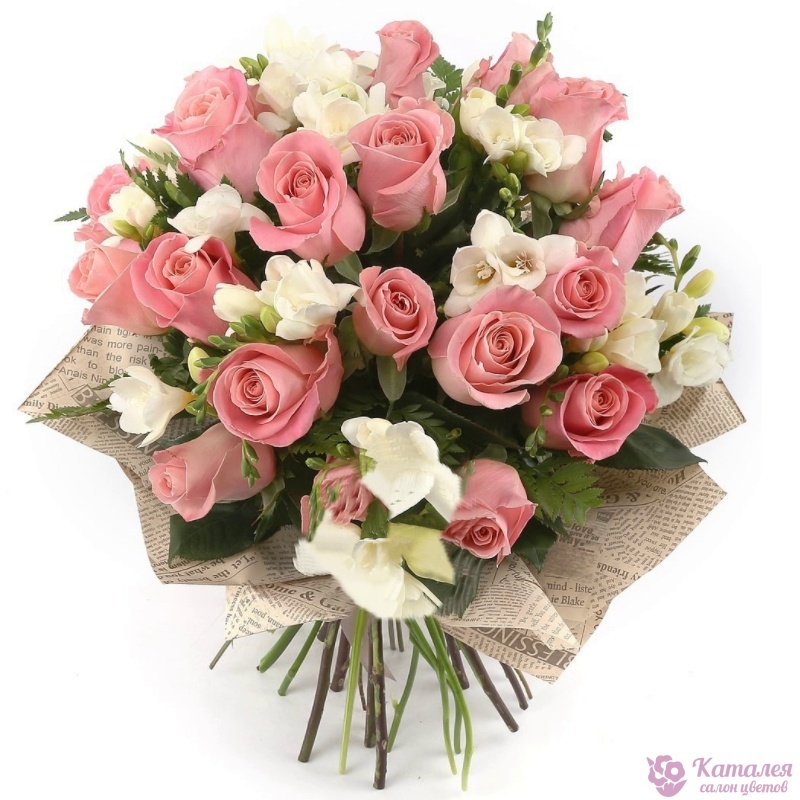 Букет состоит из 21 розовая роза, 6 белых фрезий, зелень, крафт, атласная лента.