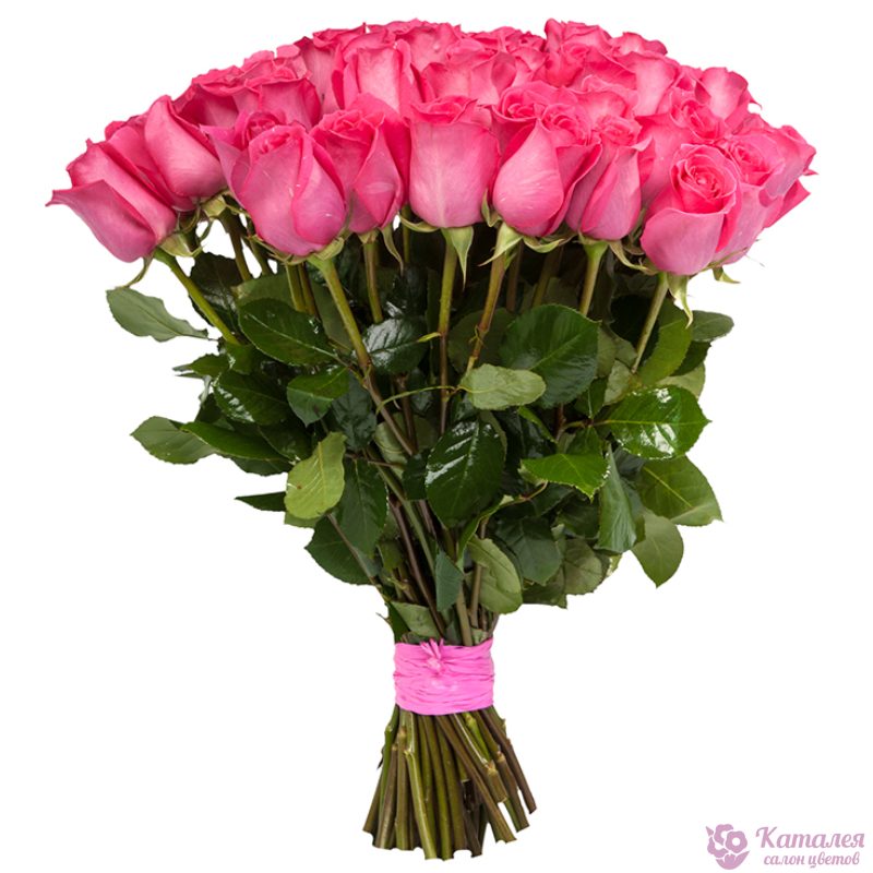Букет состоит из 45 розовых роз, прозрачная упаковка, атласная лента.