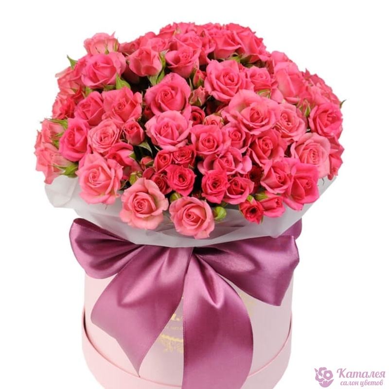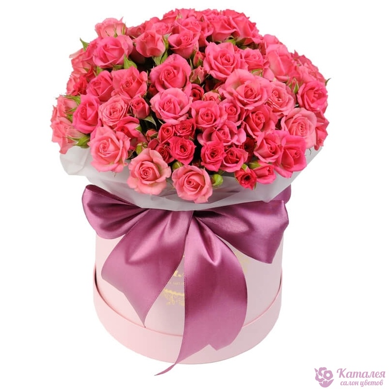 Букет состоит из 19 розовых кустовых роз, коробка, оазис, атласная лента.