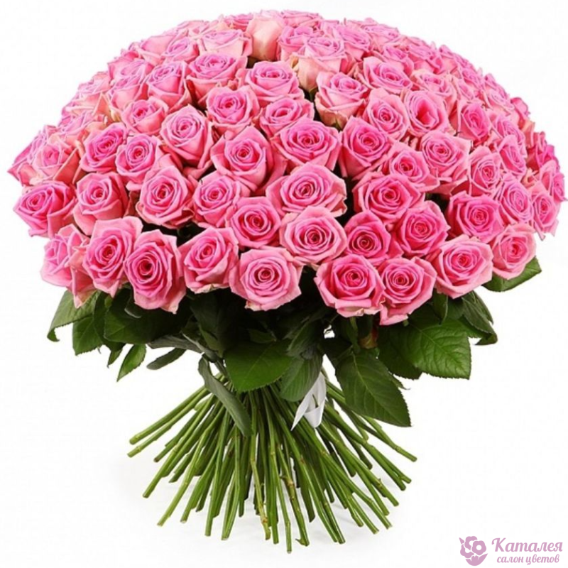Букет состоит из 101 розовая роза, прозрачная упаковка, атласная лента.