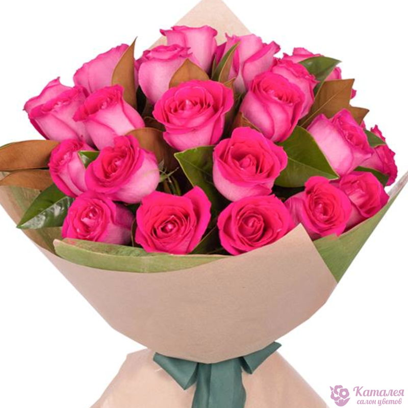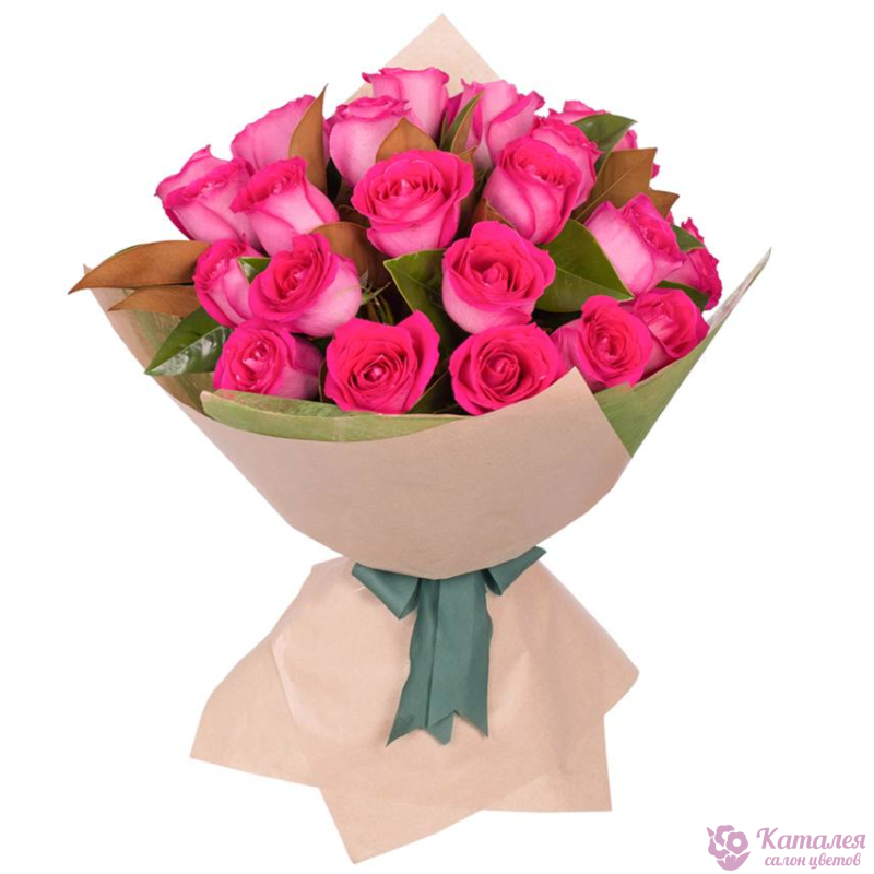 Букет состоит из 21 розовая роза, зелень, крафт, атласная лента.