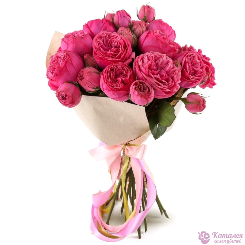 Букет состоит из 11 кустовых пионовидных роз, крафт, атласная лента.
