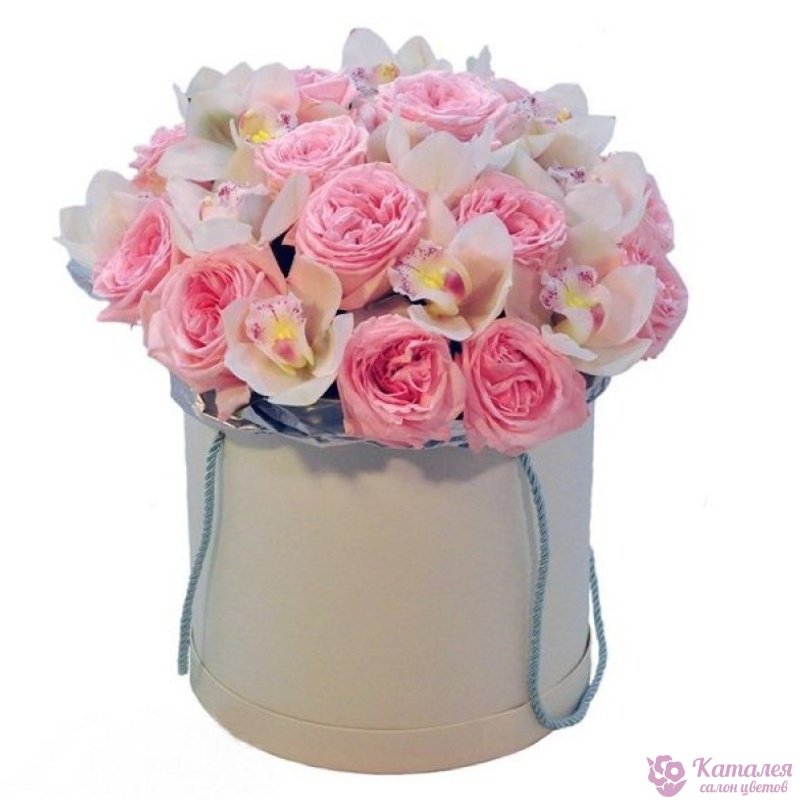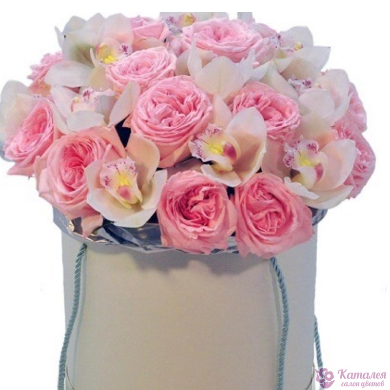 Букет из пионовидных роз и орхидей в коробке