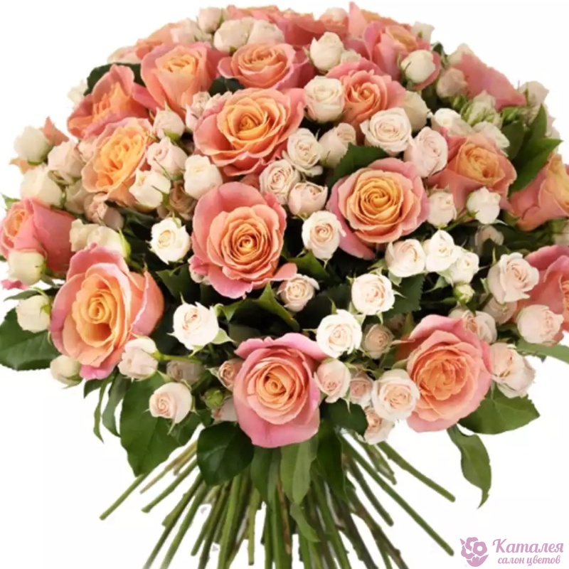 Букет состоит из 25 розовых роз, 15 кремовых кустовых роз, прозрачная упаковка, атласная лента.