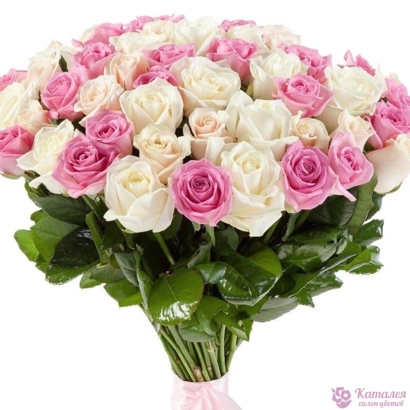 Букет состоит из 23 розовые розы, 22 белые розы, прозрачная упаковка, атласная лента.